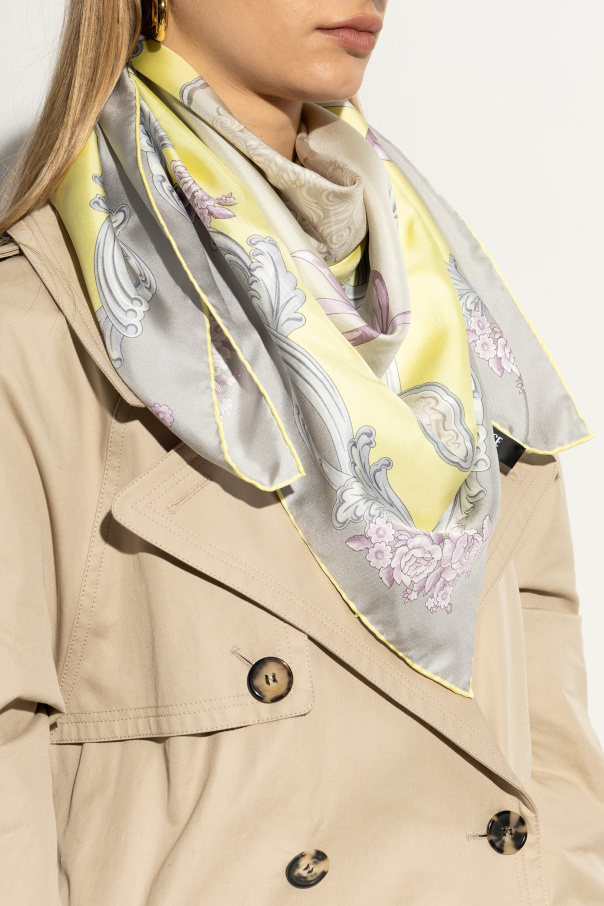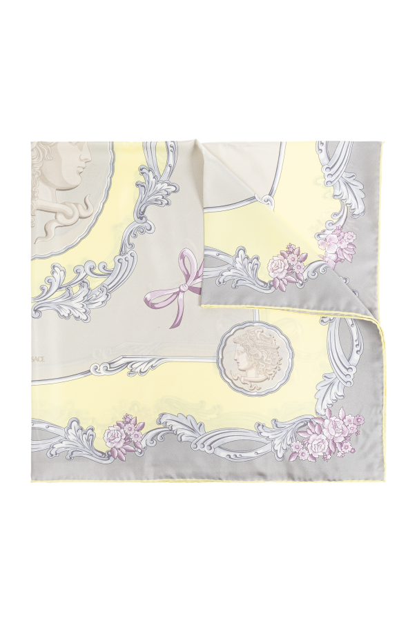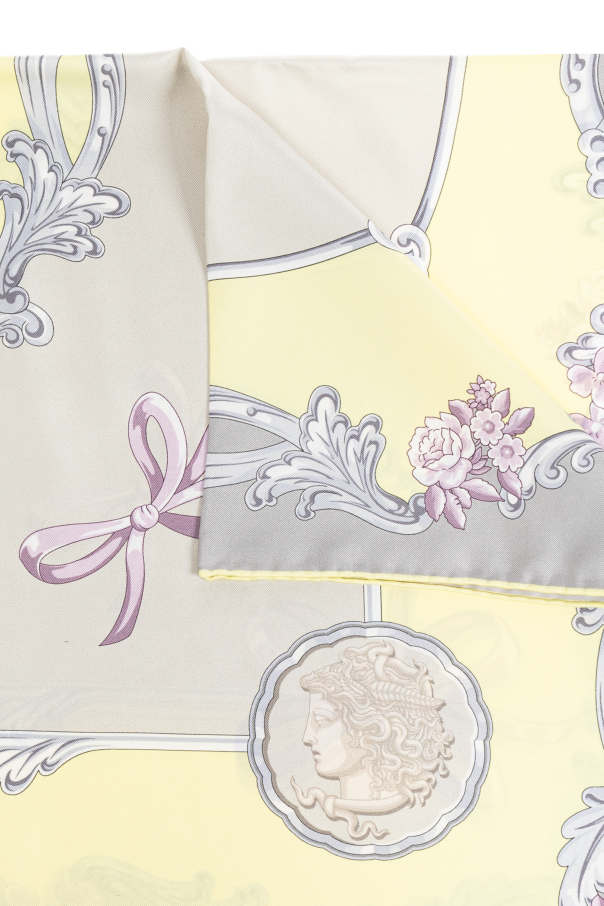 Experience the epitome of luxury with the Silk Scarf with Medusa Cameo Print from the illustrious Versace collection. This exquisite scarf, crafted from the finest silk, showcases a lustrous sheen and delicate texture that embodies sophistication. Adorned in a stunning multicolor palette of yellow, gray, and pink, the scarf features intricate decorative motifs, including elegant ornaments and floral patterns, punctuated by the iconic Medusa cameo—a hallmark of Versace\'s opulence. The discreetly placed designer logo further attests to its exclusivity. Versatile in its styling, this scarf seamlessly complements both coats and suits, making it a quintessential accessory for any gender. It gracefully transitions from formal to casual ensembles, enhancing every wardrobe with its timeless allure. Why Choose This Product? Crafted from 100% luxurious silk for an elegant finish. Features the iconic Medusa cameo and designer logo. Versatile styling options for both formal and casual occasions. A signature piece from the renowned Versace brand.