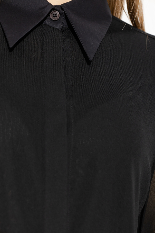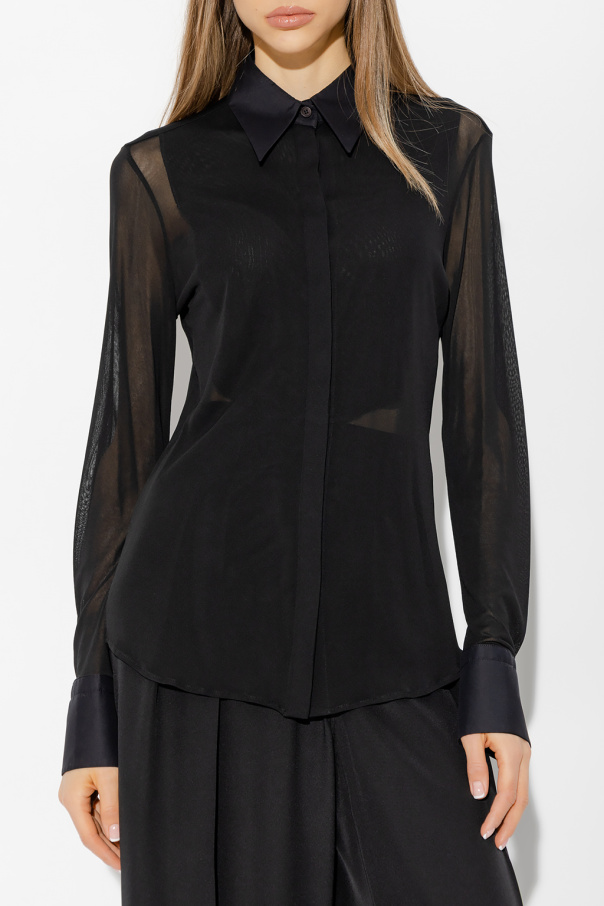 Black transparent shirt from FERRAGAMO. Fastened with buttons with a concealed placket, this garment has long sleeves with buttons in antique gold-tone at the cuffs.