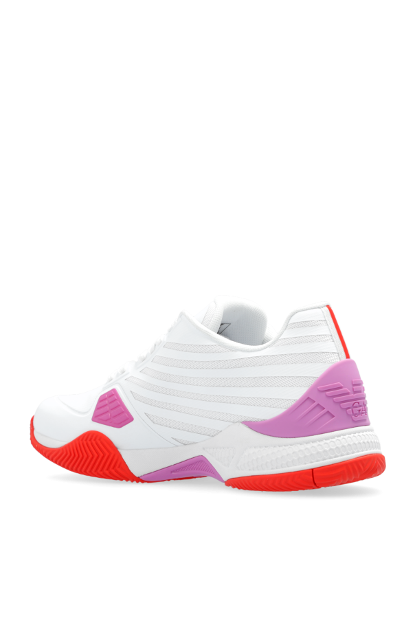 White, pink and orange sneakers from EA7 Emporio Armani. Made of fabric, this lace-up pair features a printed and embossed logo and a rubber sole in orange, pink and white.