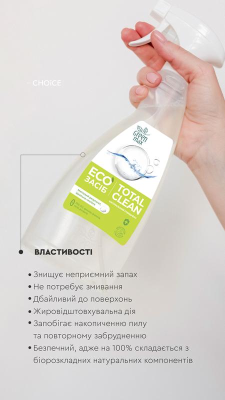 Многофункциональный очиститель Total Сlean для ежедневного использования обеспечивает исключительную чистоту и безупречный блеск, не оставляя после себя едкого и токсического налета.