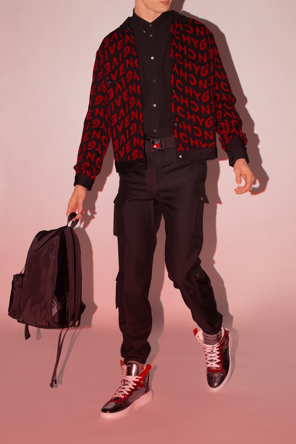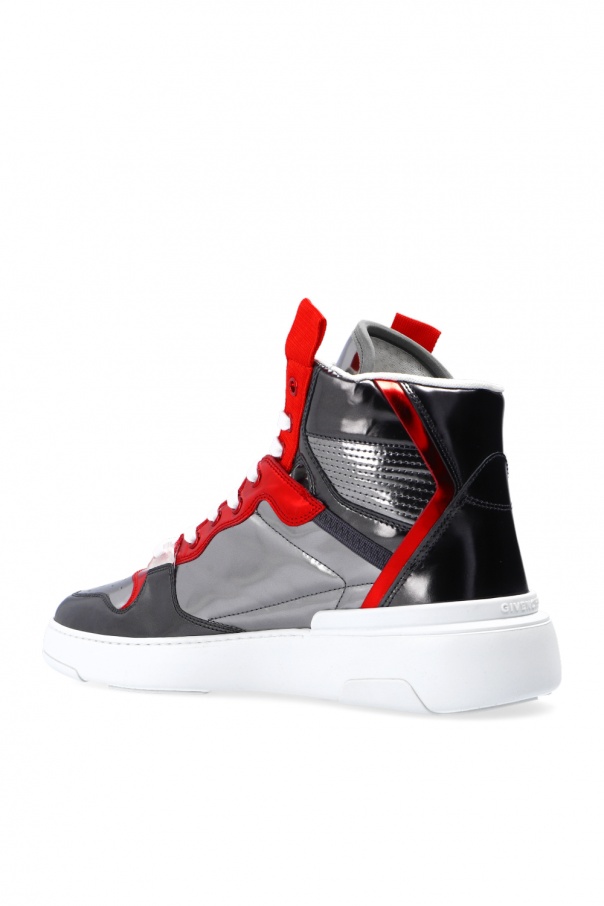 Red and silver-tone ‘Wing’ high-top sneakers from Givenchy. Crafted from calf leather, this lace-up model features a white logo print, decorative stitching details and a white rubber sole.