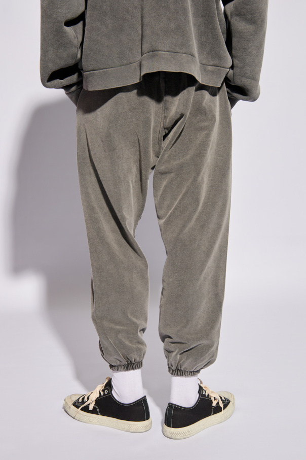 Grey sweatpants from Acne Studios. Made from washed organic cotton, this pair is cinched with drawstrings at the waistband and features a transparent rubber patch with a logo on the back, two slant front pockets and ribbed cuffs.