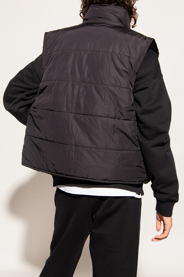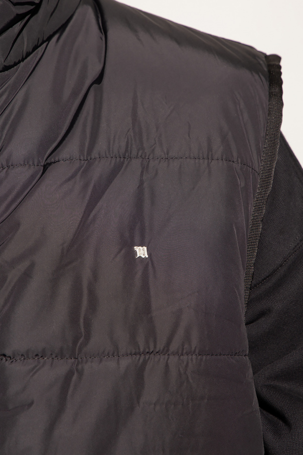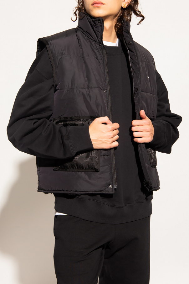 Black insulated vest from MISBHV. Enriched by a silver-tone metal logo plaque on the front, this style features zip and snap fastenings, two snap-fastened flap pockets accentuated with a monogram pattern, and a faux-fur lining.