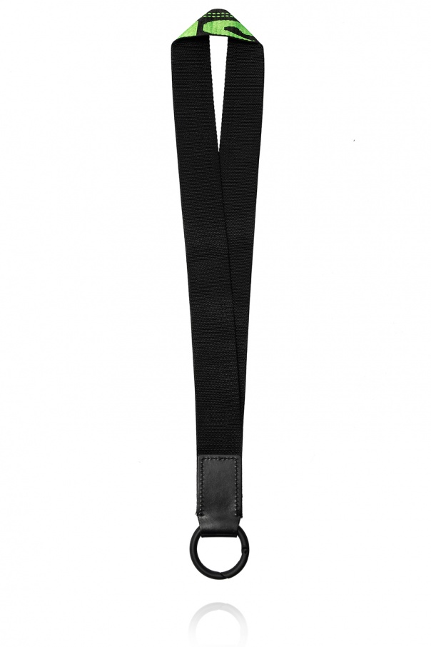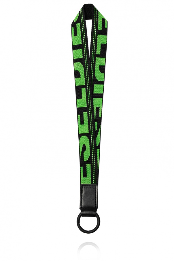 Black lanyard from Diesel featuring a green logo embroidery and round snap hook.