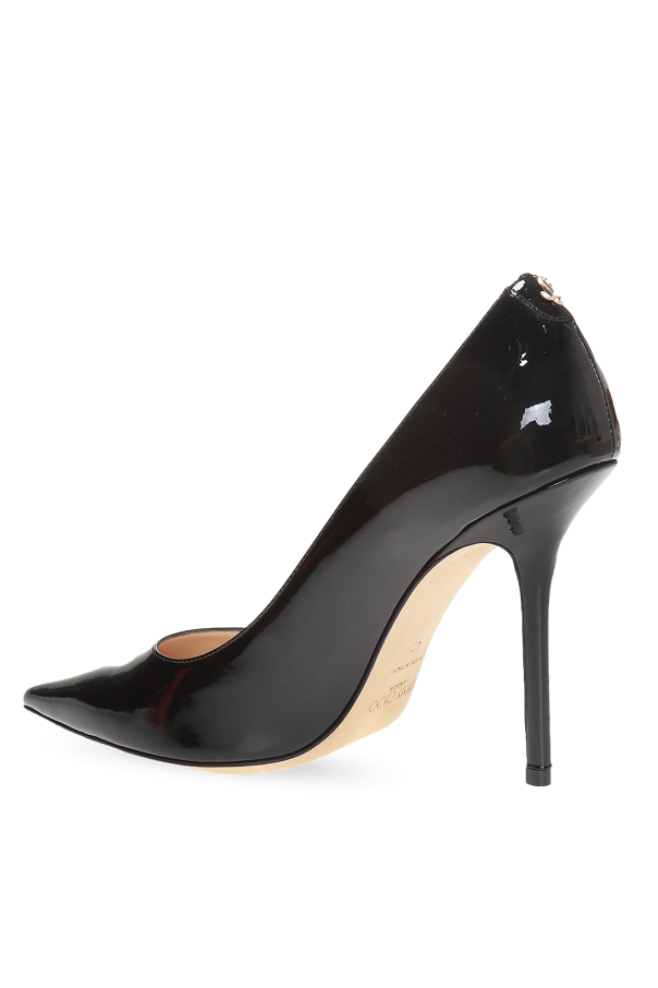 Black ‘Love’ stiletto pumps from Jimmy Choo. Made of smooth patent leather. Embellished with gold-tone metal logo. They also feature beige leather sole.