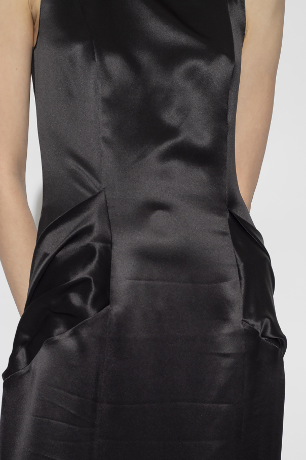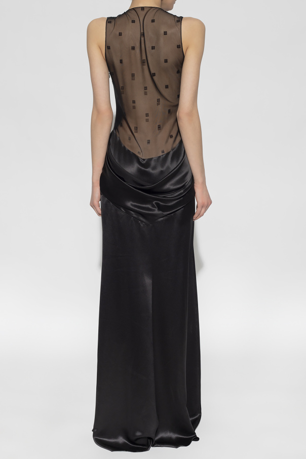 Black sleeveless dress from Givenchy. Made of lustrous silk, this style fastens with a hidden side zipper and features a transparent insert with the brand\'s logo at the back.