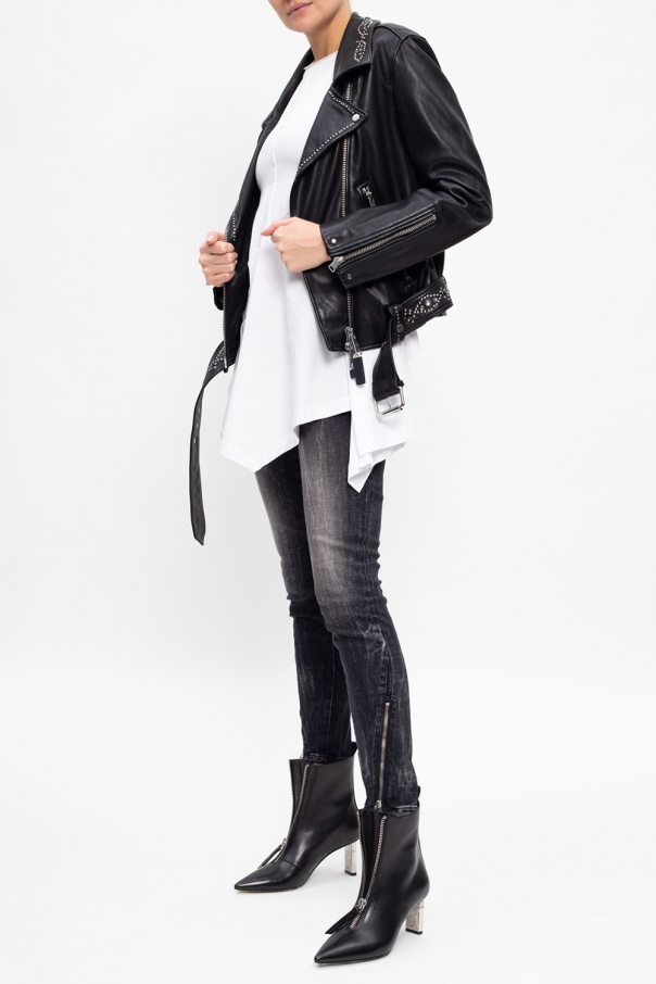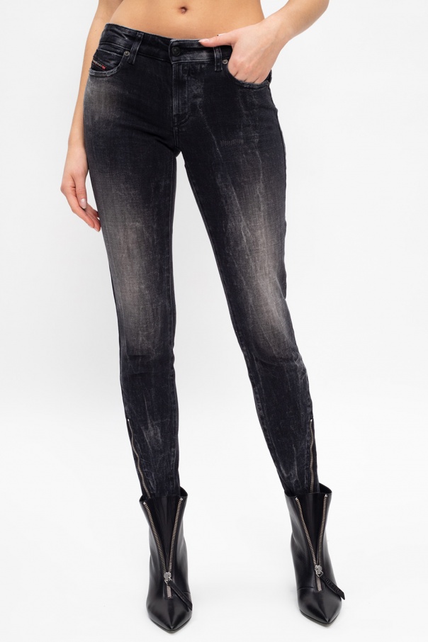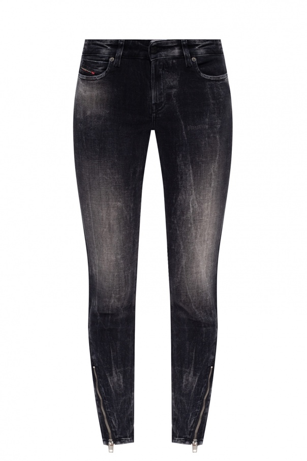 Grey \'D-Jevel\' jeans from Diesel. Crafted from stretchy cotton denim with distressed effects, this pair fastens via a zip and buttons and showcases classic five pockets, zipped vents at the cuffs and logo appliqués for the brand recognition.