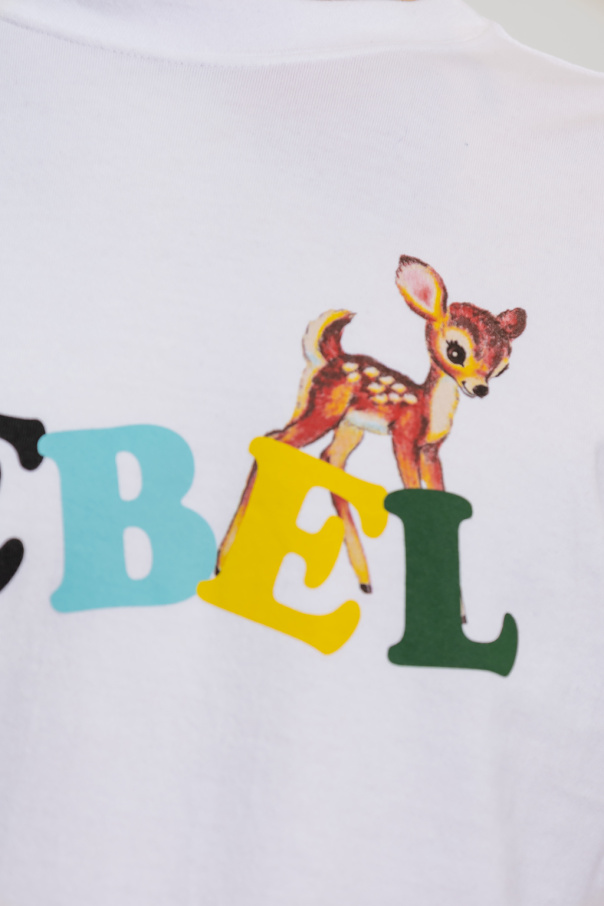 White T-shirt from Undercover. Made of cotton, this design features a multicolored REBEL lettering, fawn print and ribbed trims at the round neck and cuffs.