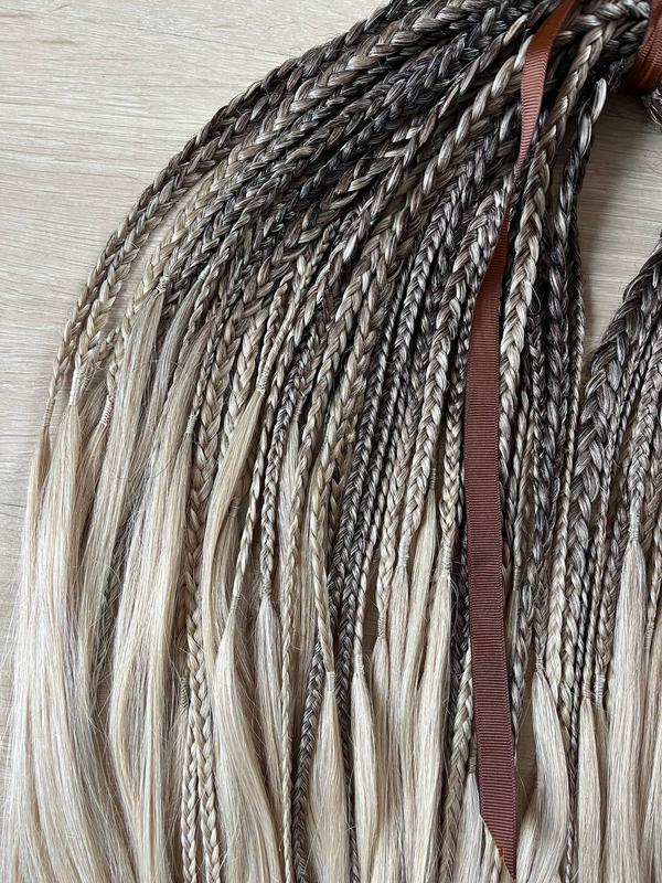 Афрокоси ДЕ, новий комплект косичок з розпущеним кінчиком, ручна робота. Ідеально підійдуть для вплетіння на волосся русого кольору. Преміум матеріал. Легко розчісується. Кінчики м'які, схожі на натуральне волосся. Кінчики можна накрутити на плойку.