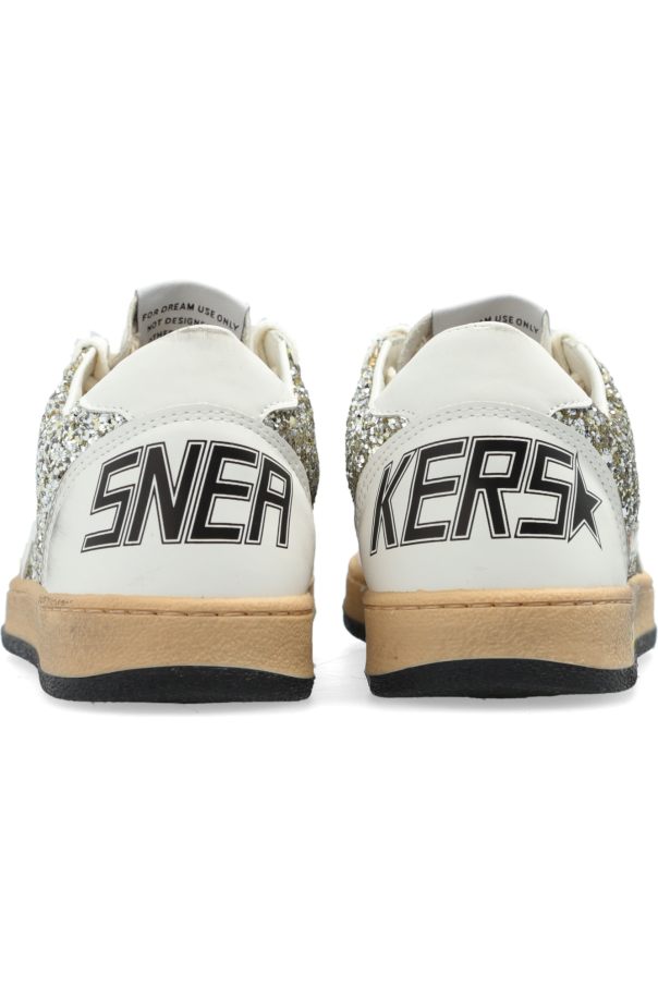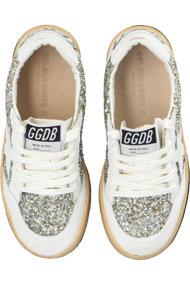 White ‘Ball Star New’ sneakers from Golden Goose Kids. Made of leather and spruced up with silver-tone glitter, this lace-up model sits on a black and beige rubber sole and features a printed logo, distressed details and a signature star patch.