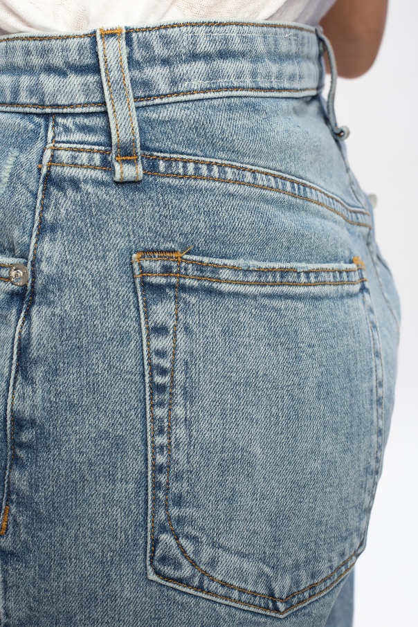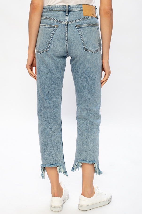 Blue ‘Maya’ trousers with raw edge from Rag & Bone. Fastened with buttons, this design features button fastenings, a beige logo patch, orange stitching details and decorative cut-outs as well as three pockets on the front and two at the back.