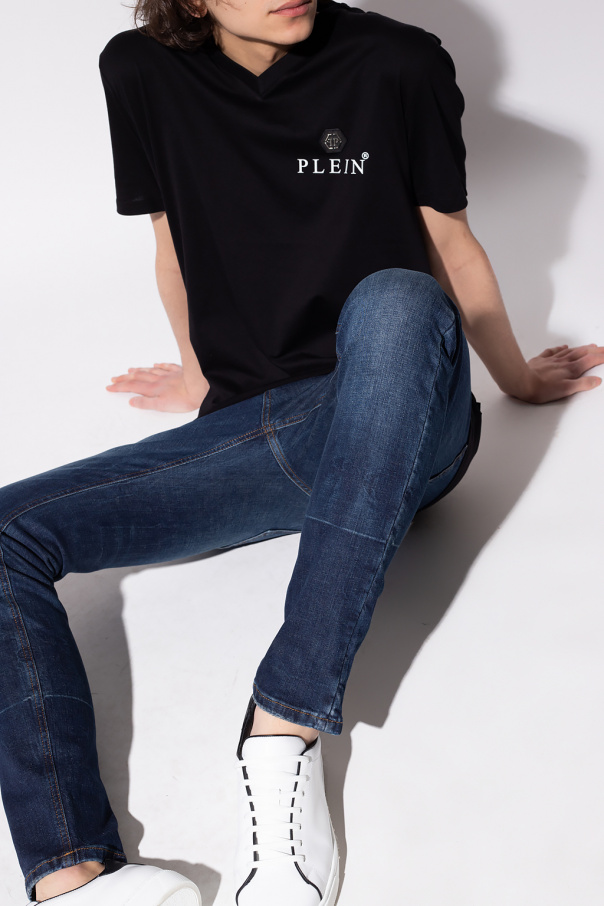 Black V-neck T-shirt from Philipp Plein. Made of cotton, this style showcases a white logo print and a tactile logo emblem.