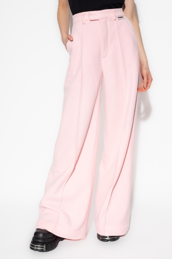 Light pink pleat-front trousers from VETEMENTS. Made of fleece, this design features a zip, hook and button closure, rubber logo patch, two front pockets, two buttoned back pockets and wide legs.