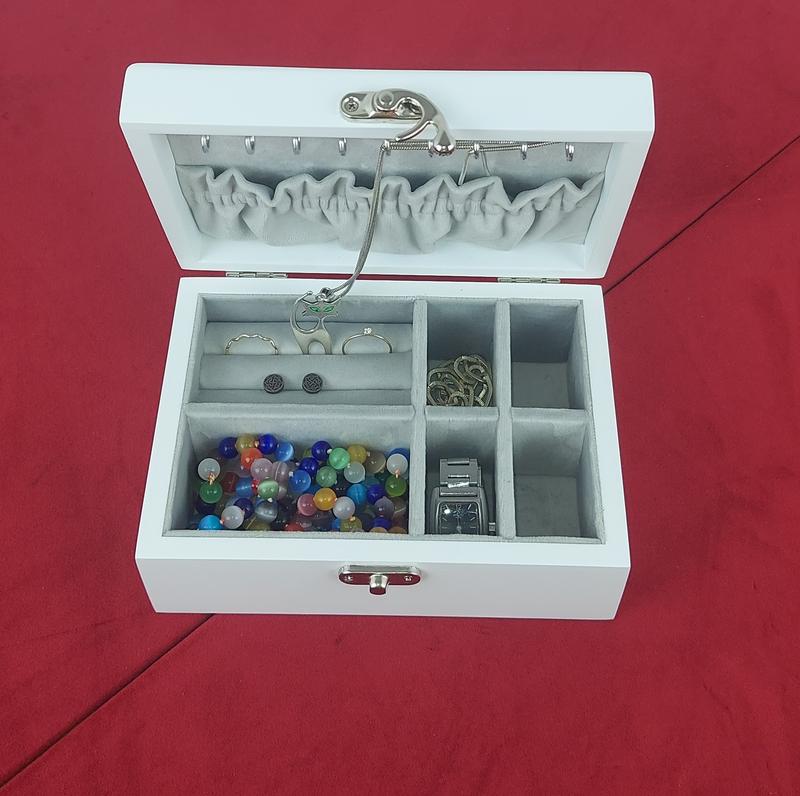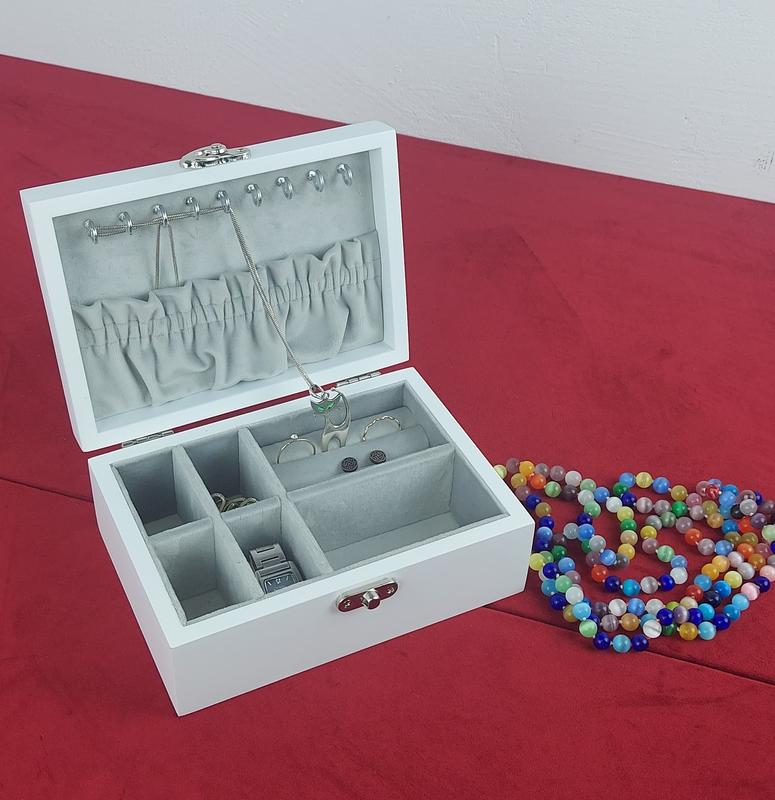 Шкатулочка для украшений белого цвета с серым бархатом, 170*120*70 мм ТМ Wooden Organizer предназначена для хранения ювелирных изделий, бижутерии и аксессуаров. Имеет компактные размеры, поэтому не будет занимать много места у Вас на полке.