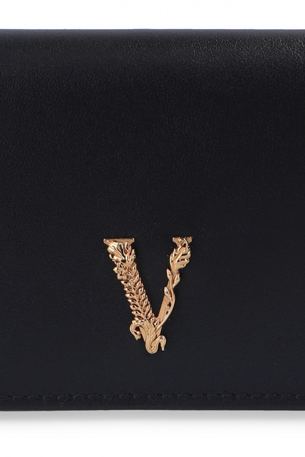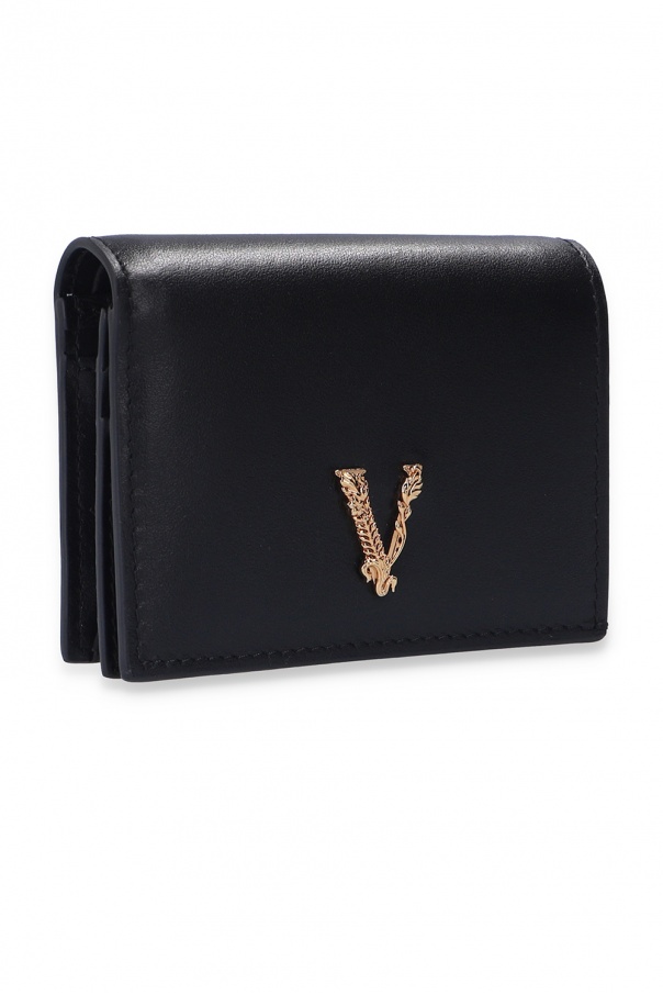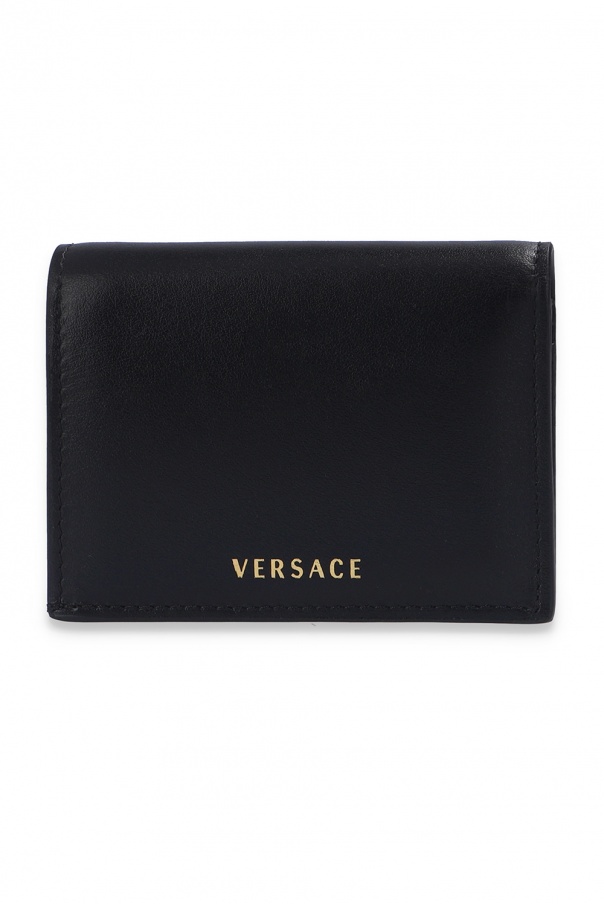 Black wallet from Versace. Emblazoned with a logo appliqué, this leather-crafted item fastens via a snap-button and employs a gold-tone metal hardware and interior with a bills compartment, five card slots, one slip pocket and one zipped coins pocket.