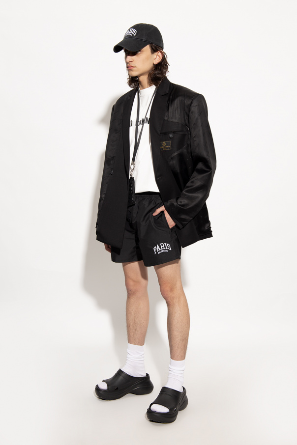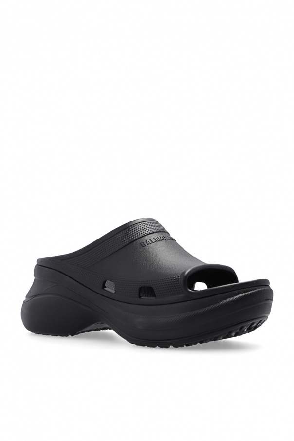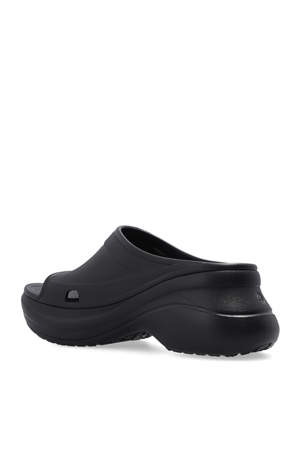 Black ‘Pool’ platform slides from Balenciaga x Crocs. Made of lightweight EVA foam, this pair features a raised logo and black rubber sole.