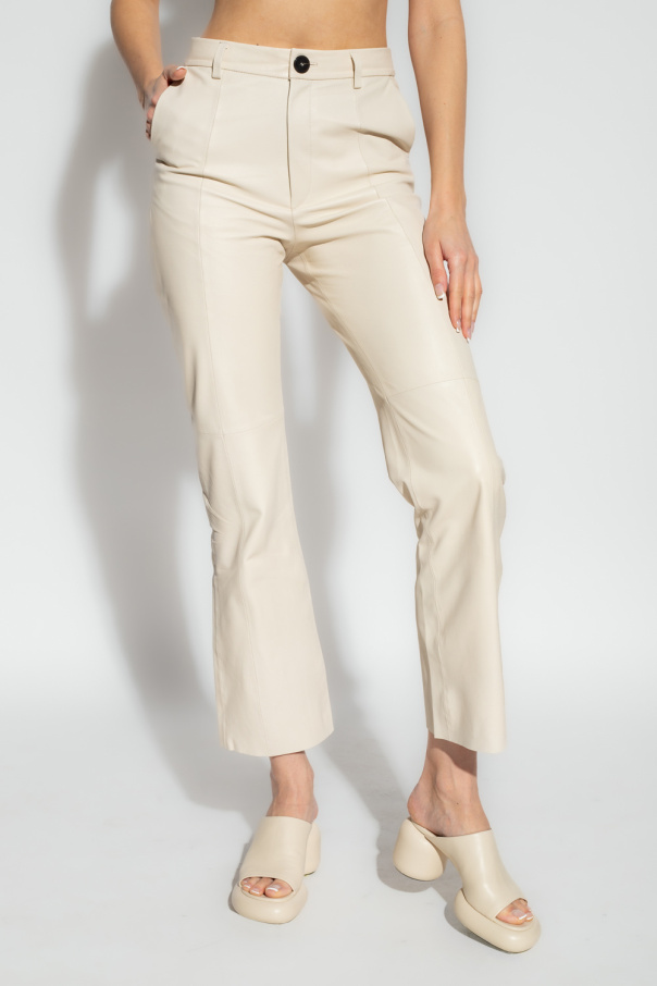 Cream trousers from Forte Forte. Made of leather, this straight leg pair features a zip and button closure, two front pockets, one back pocket and raw-trimmed edges.