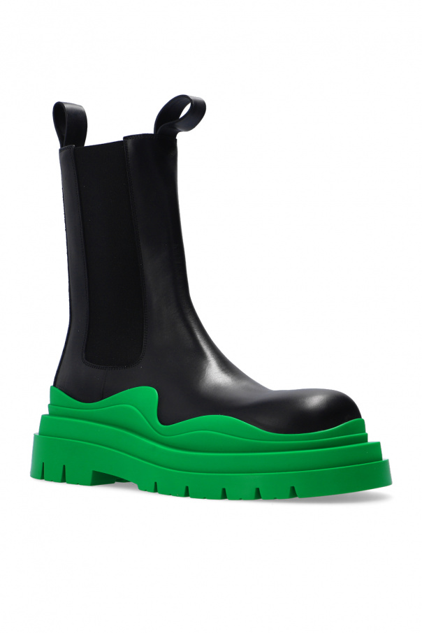 Black boots from Bottega Veneta. Made of leather, this almond toe silhouette is complete with elastic side panels and a green rubber sole.