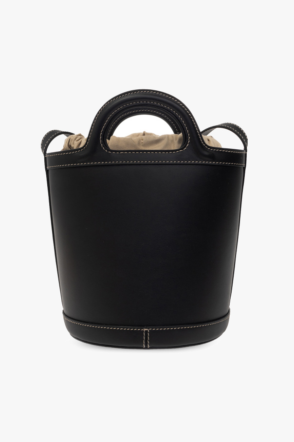 Black ‘Tropicalia Small’ bucket bag from Marni. Crafted from calf leather, this design showcases a tactile logo on the front and contrasting white stitching details. It is complete with an adjustable shoulder strap, two handles, gold-tone metal hardware and a drawstring canvas pouch with a zip pocket inside.
