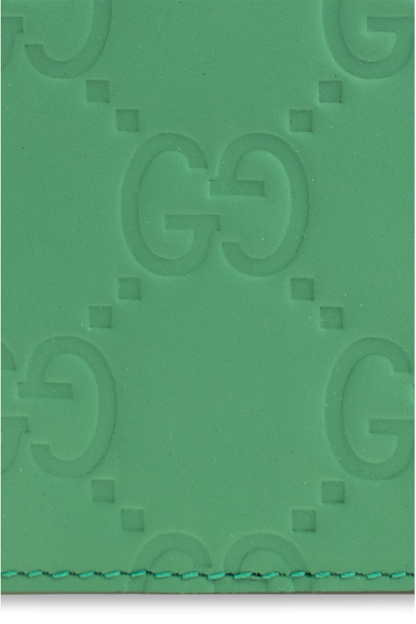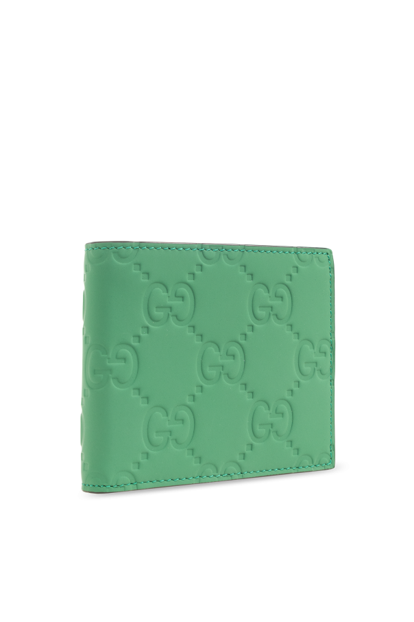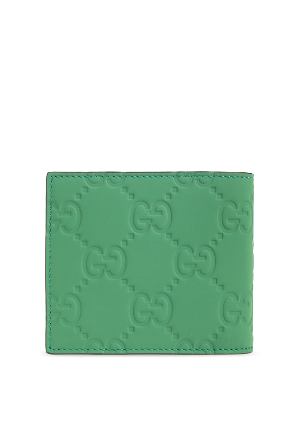 Green folding wallet from Gucci. Made from rubberised calf leather, this design showcases an embossed monogram as well as two bill compartments, two slip pockets and eight card slots inside.