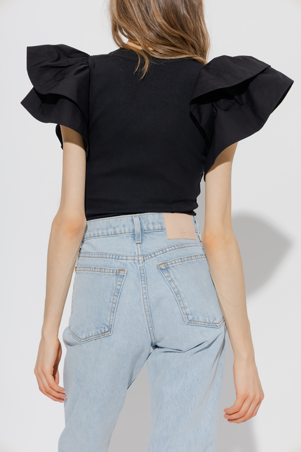 Black ‘Bonnie’ ribbed fitted top from Ulla Johnson. Fastened with buttons, this round neck design features button fastenings and short sleeves with ruffles.