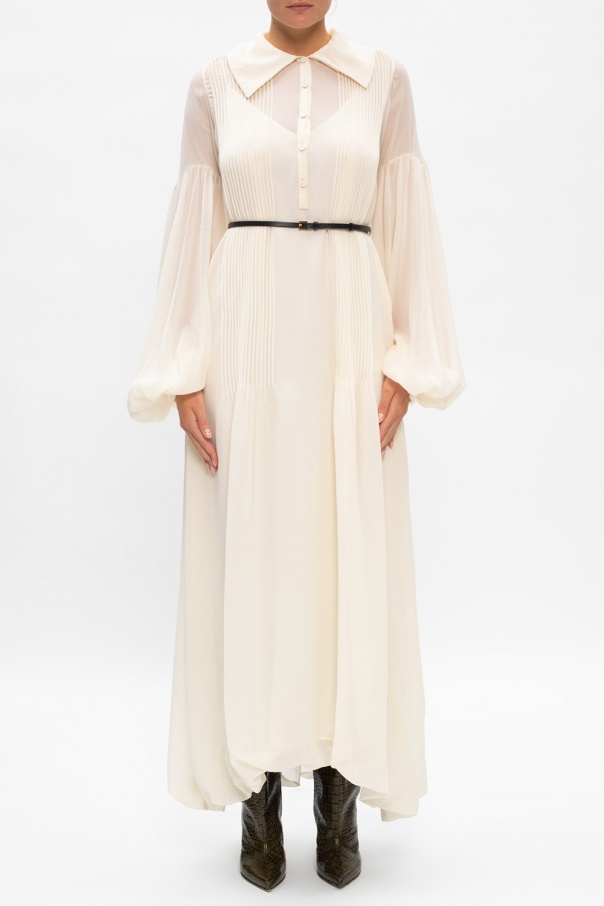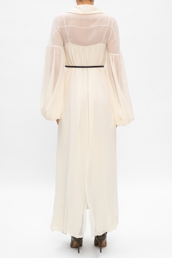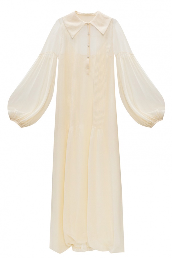 Cream dress with a collar from Jil Sander. Fastened with buttons, this garment is enriched with gathers and long puff sleeves.