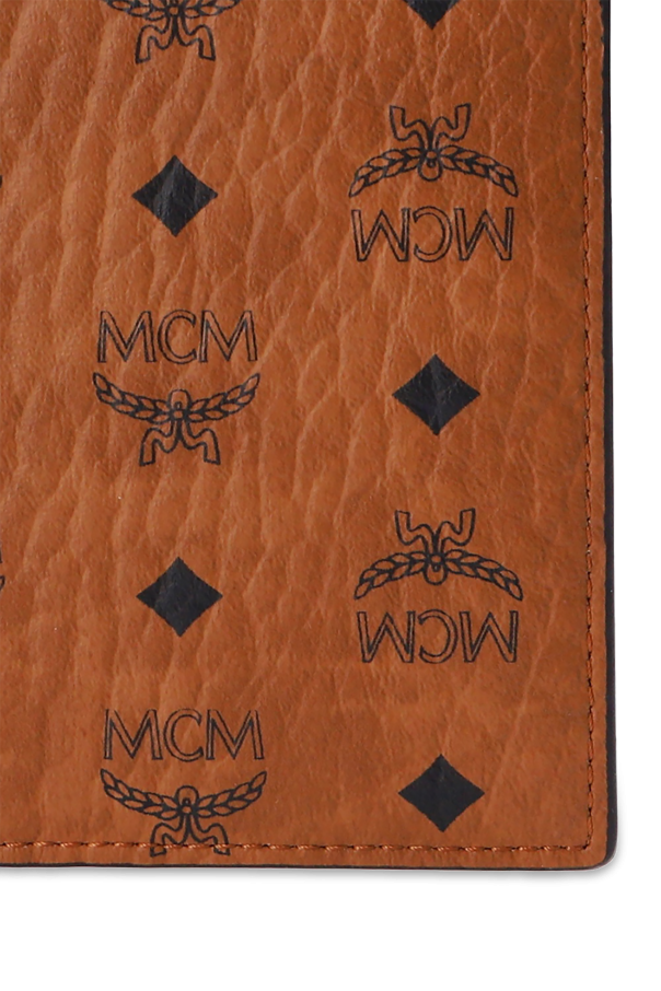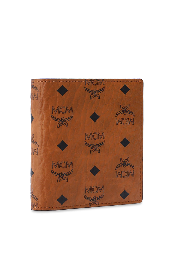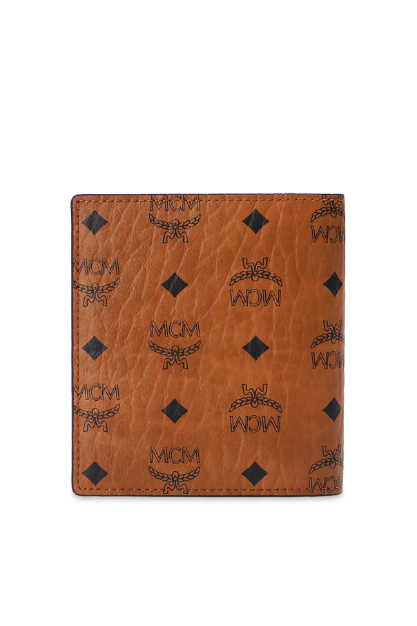 Brown folded wallet from MCM. Crafted from the brand’s signature canvas with leather trims, this item features a black logo pattern and eight internal card slots.