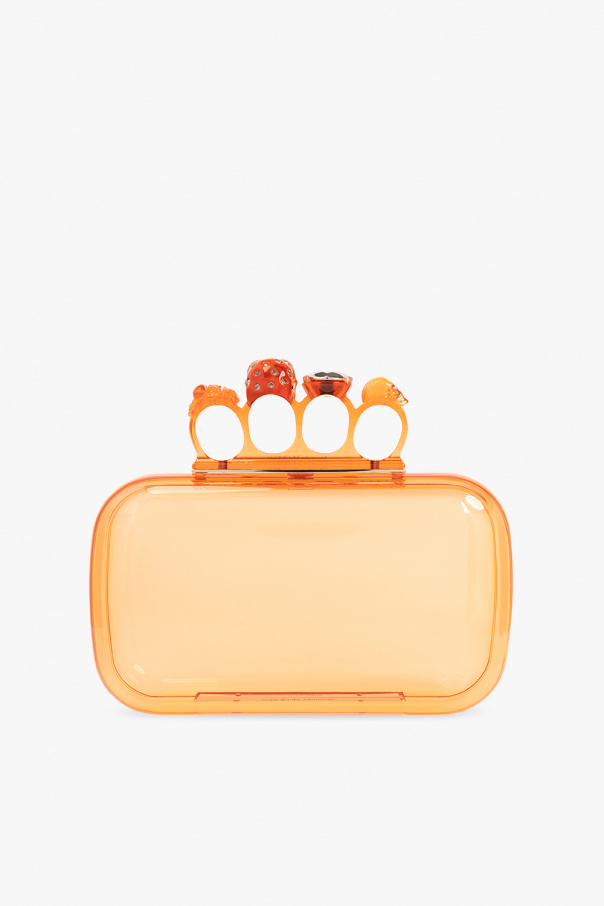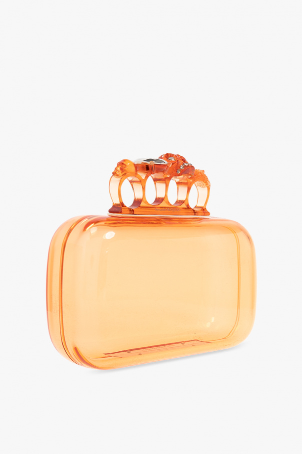 Orange, transparent ‘Skull Four Ring’ clutch from Alexander McQueen. Made of plastic, this model is complete with a snap closure and decorative ring handle with the label’s signature skull motif embellished with crystals.