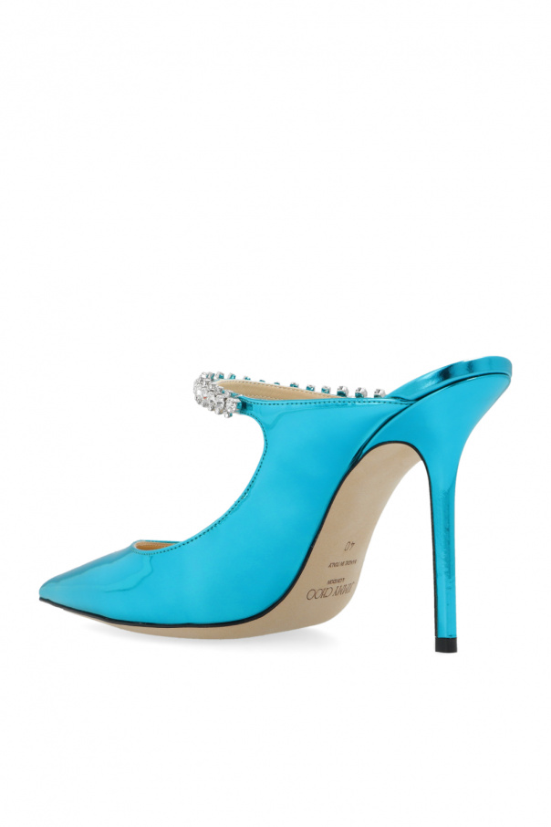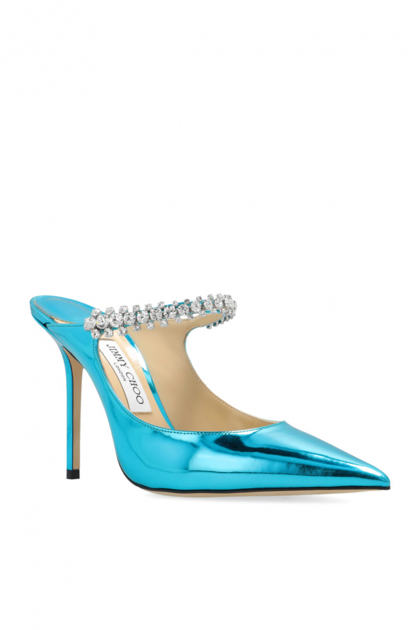Blue ‘Bing’ heeled mules from Jimmy Choo. Made of leather with a mirror effect, this pointed toe design features a crystal-embellished strap and beige leather sole.