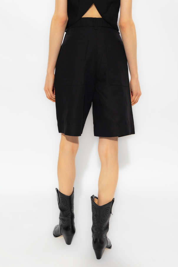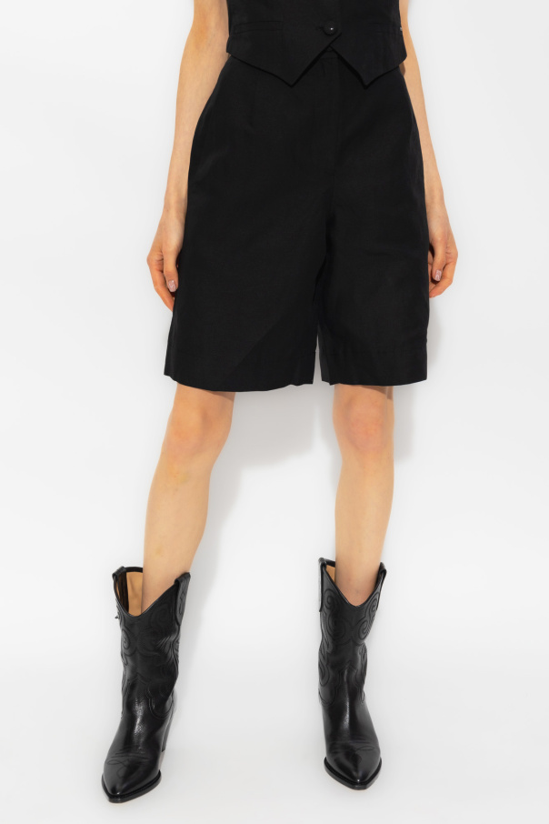 Black ‘Petra’ high-waisted shorts from AllSaints. Crafted from a blend of eco TENCEL™ and linen, this pair features a zip and button fastening, metal logo-engraved detail in silver-tone and four slip pockets.