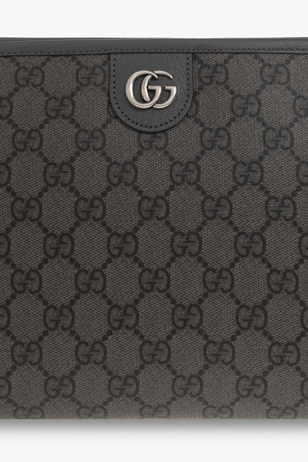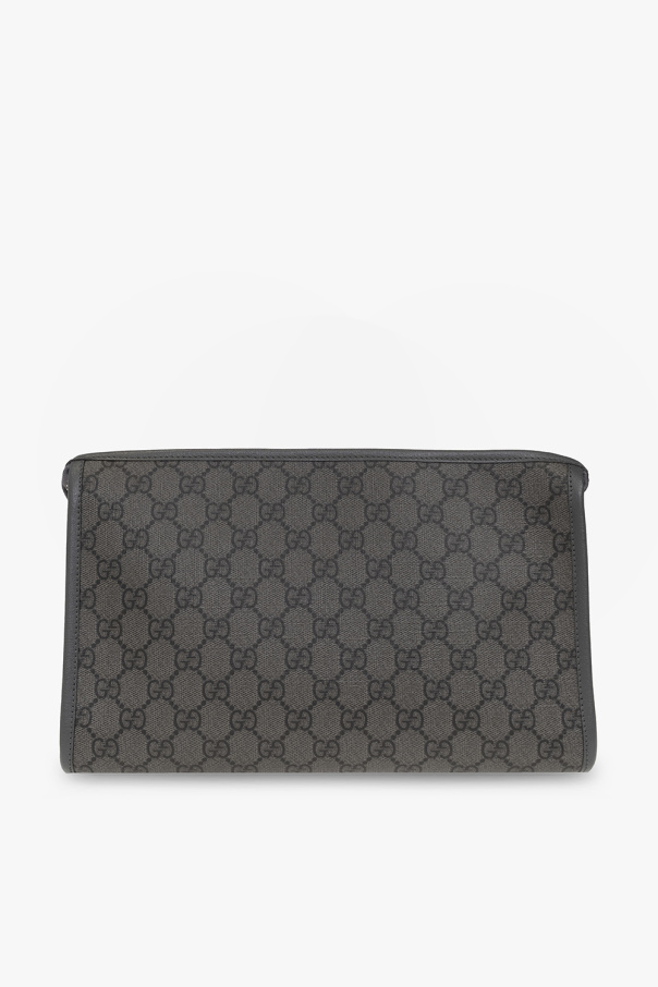 Dark grey wash bag from Gucci. Made of the brand’s signature GG Supreme canvas with leather trims, this model is complete with a zip fastening, snap fastenings on the sides, silver-tone metal detail, silver-tone metal hardware and one internal compartment with one zip pocket.