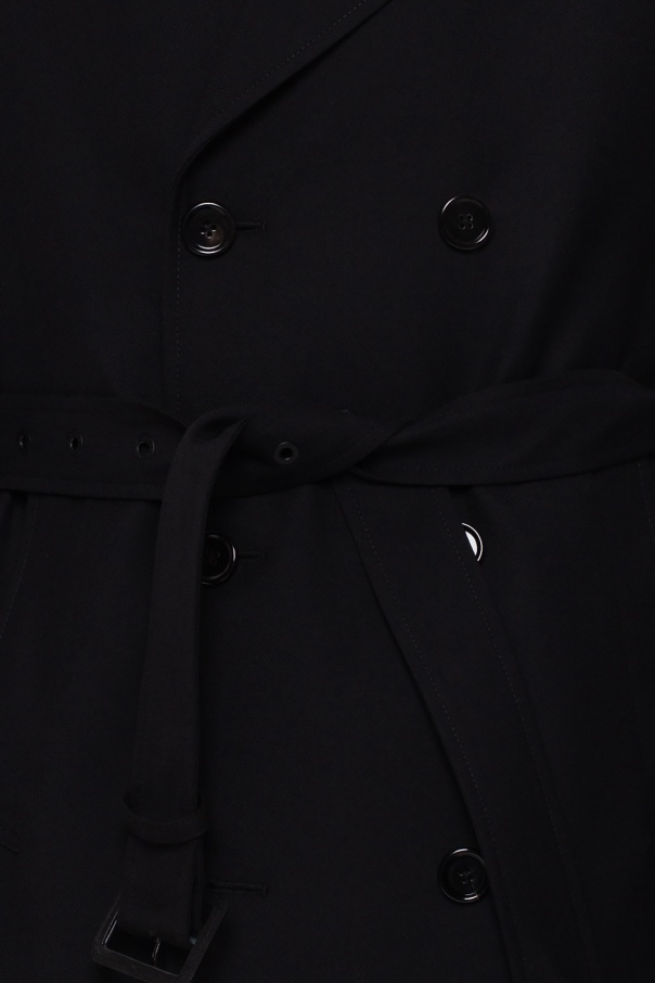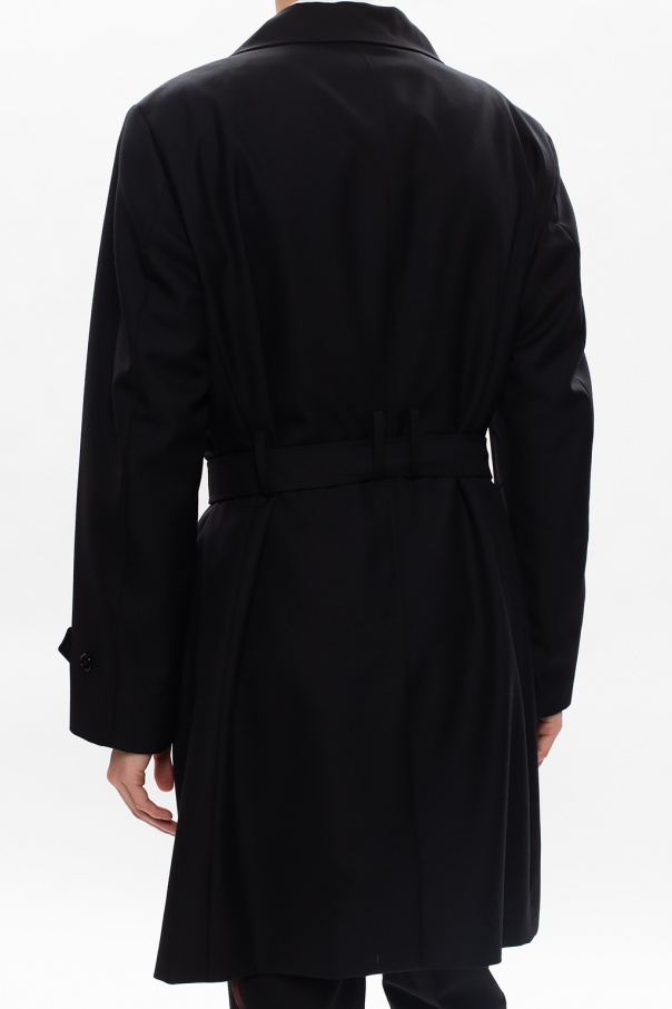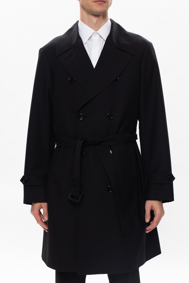 Black coat from Dolce & Gabbana. Shaped from wool fabric to a double-breasted silhouette with peaked lapels, this style fastens via brown-hued buttons and comes with a back vent and an included belt with a leather-encases buckle.