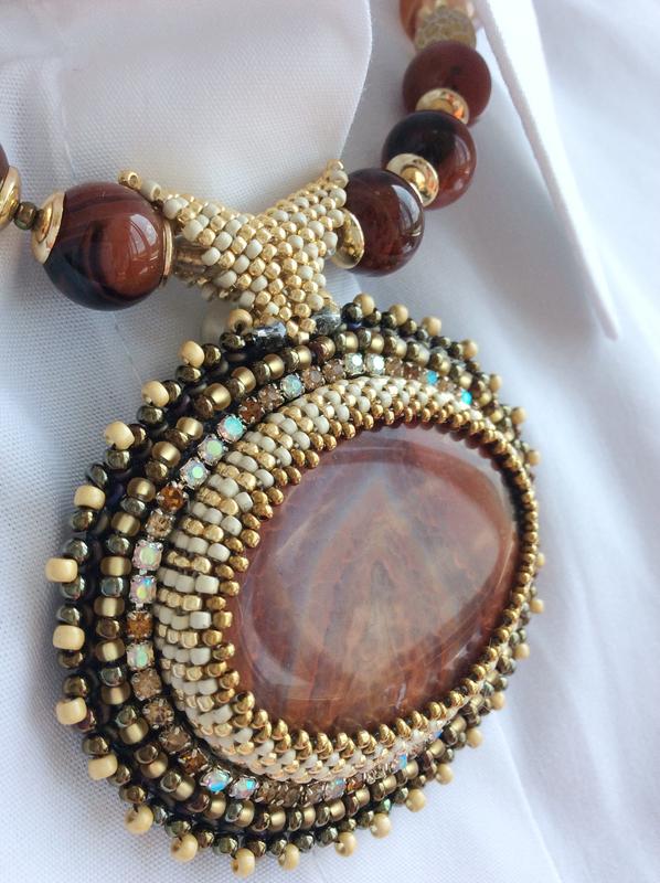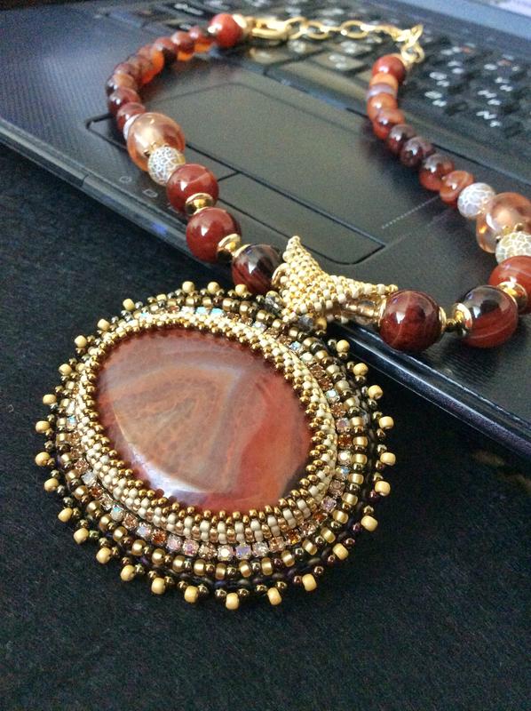 Женский Кулон из натурального камня агат, обшитый мельчайшим позолоченным японским бисером, подвешеный на бусины и цепочку, задняя часть кулона выполнена из натуральной замши