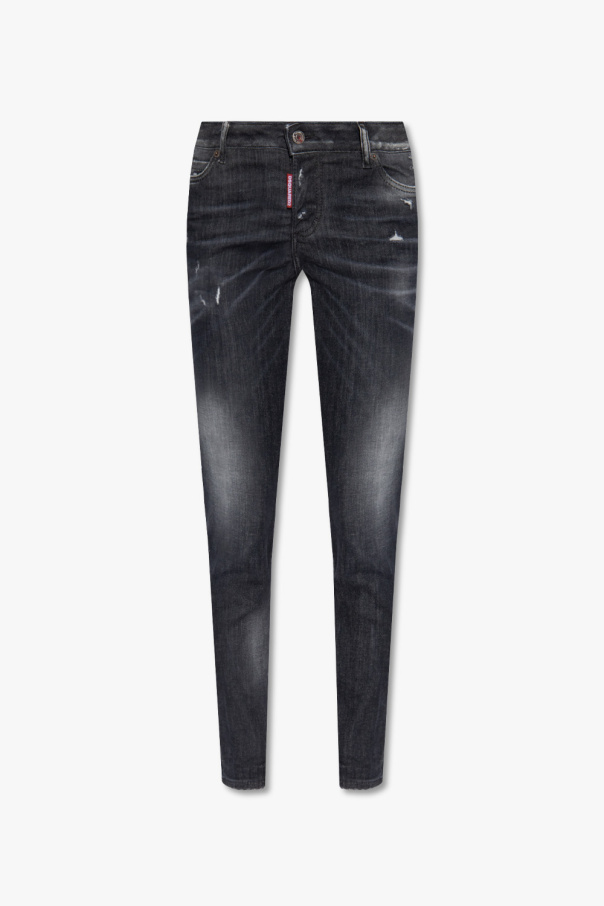 Grey ‘Jennifer’ jeans from Dsquared2. Made of cotton with a vintage effect, this pair falls with tapered legs and features button closures, classic five pockets and a black patch with an embossed logo at the back.