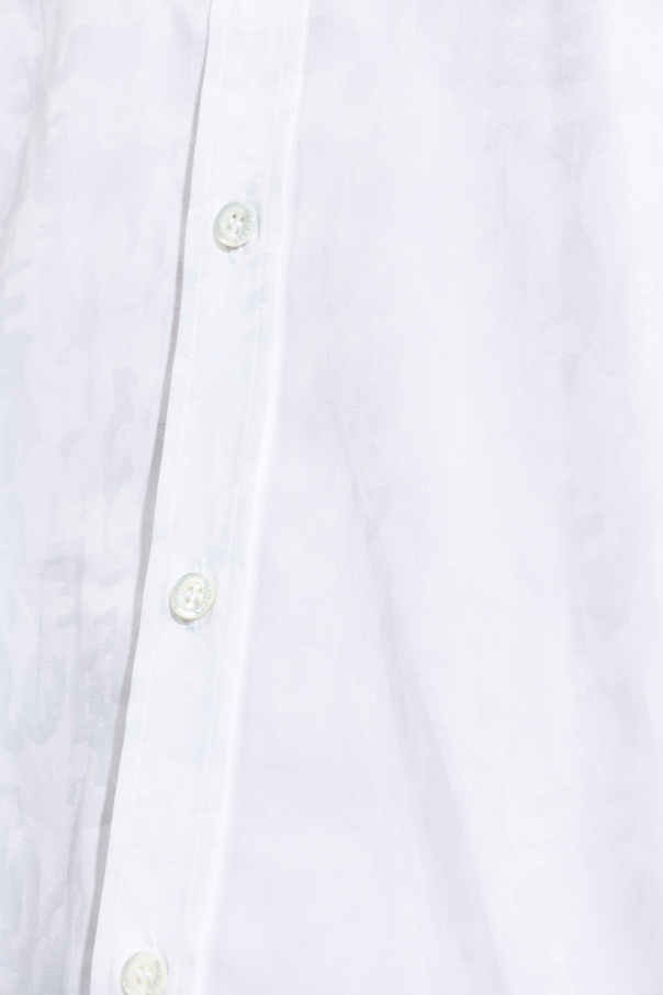 White and black shirt with a monogram from Alexander McQueen. Made of cotton, this garment has button fastenings, decorative buckle belt and short sleeves with buttoned cuffs.