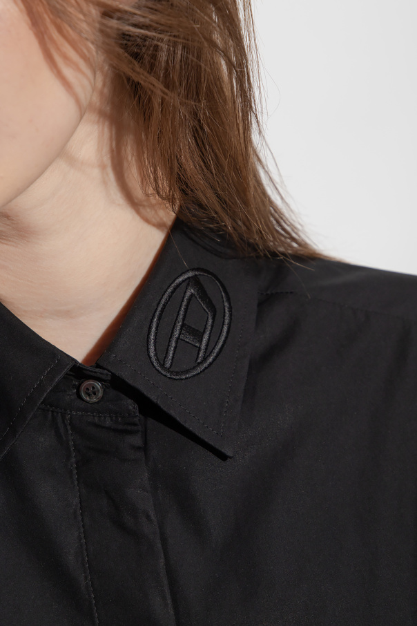 Black ‘C-ENTELA’ shirt from Diesel. Made of cotton, this loose-fitting design features buttons with a concealed placket and snaps, logo-embroidered collar, long sleeves with buttoned cuffs as well as an asymmetric drawstring hem.