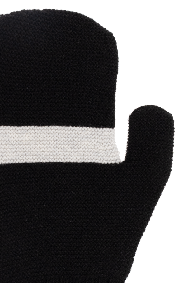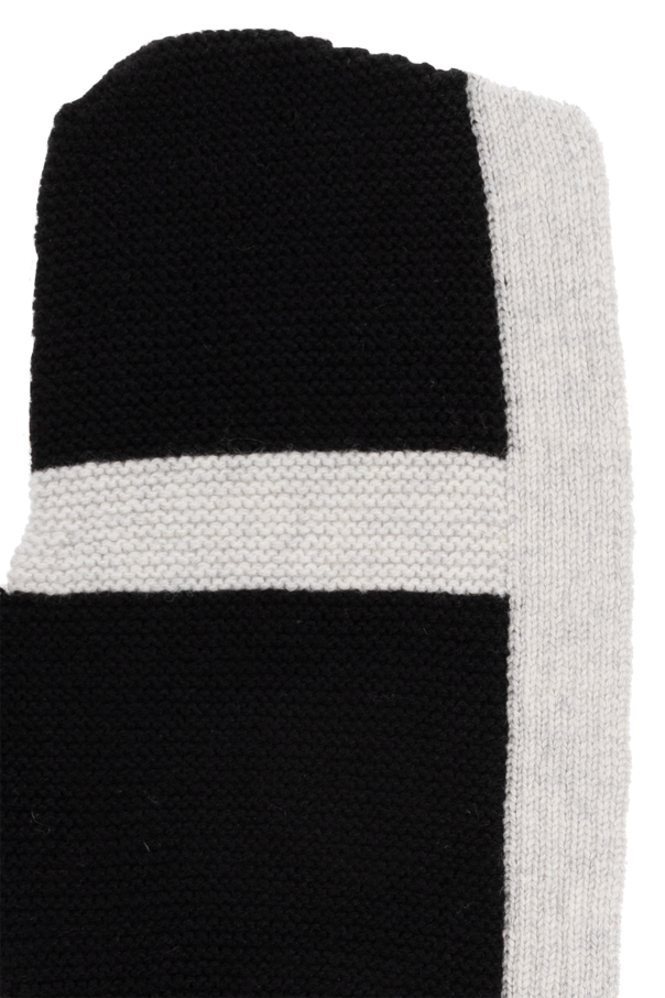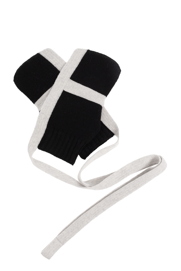 Black and grey gloves from Issey Miyake Homme Plisse. Made of wool, this pair is connected via a cord and features ribbed cuffs.