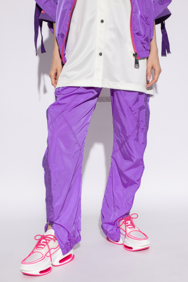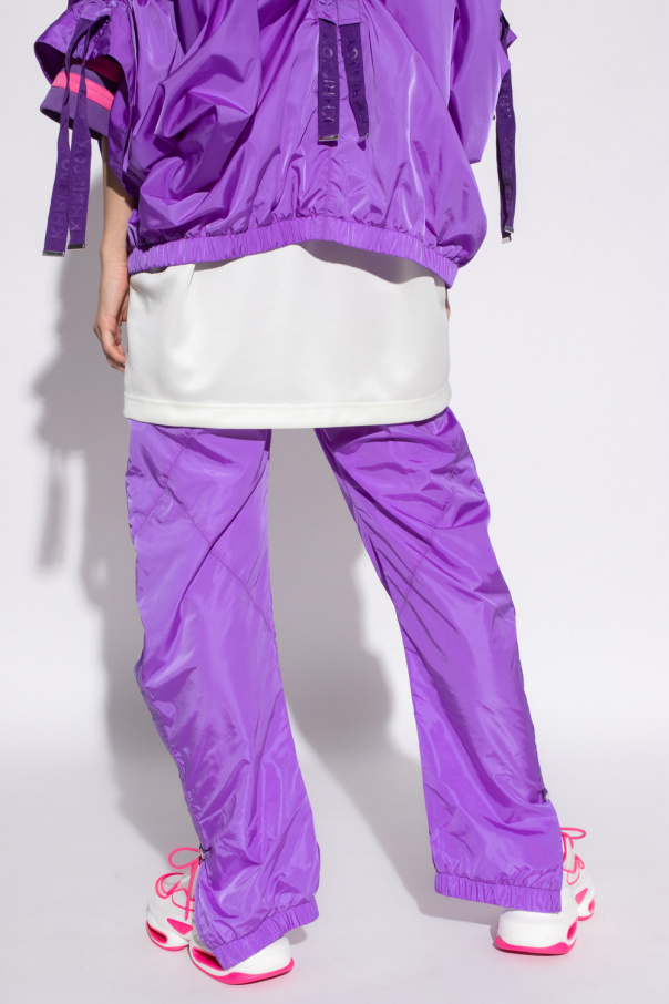 Purple nylon trousers from Khrisjoy. Accentuated with topstitching details, this pair features a drawstring waistband, two slip pockets and hem splits.