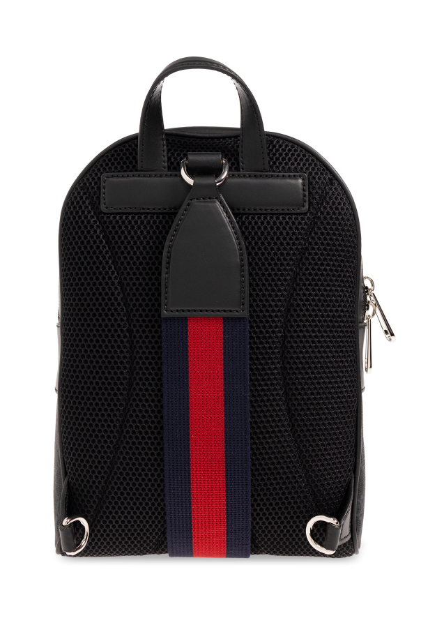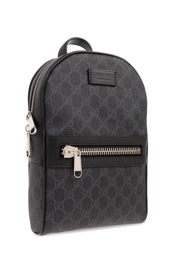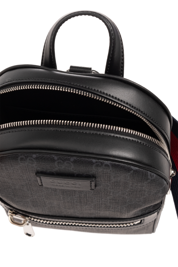Black and dark grey one-shoulder backpack from Gucci. Made from the brand’s signature GG Supreme canvas with calf leather trims, this model features a a two-way zip fastening, top handle, adjustable shoulder strap with a navy and red Web stripe, silver-tone metal hardware and one internal compartment with one slip pocket.