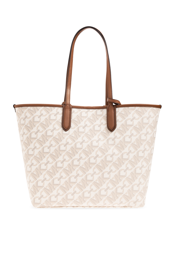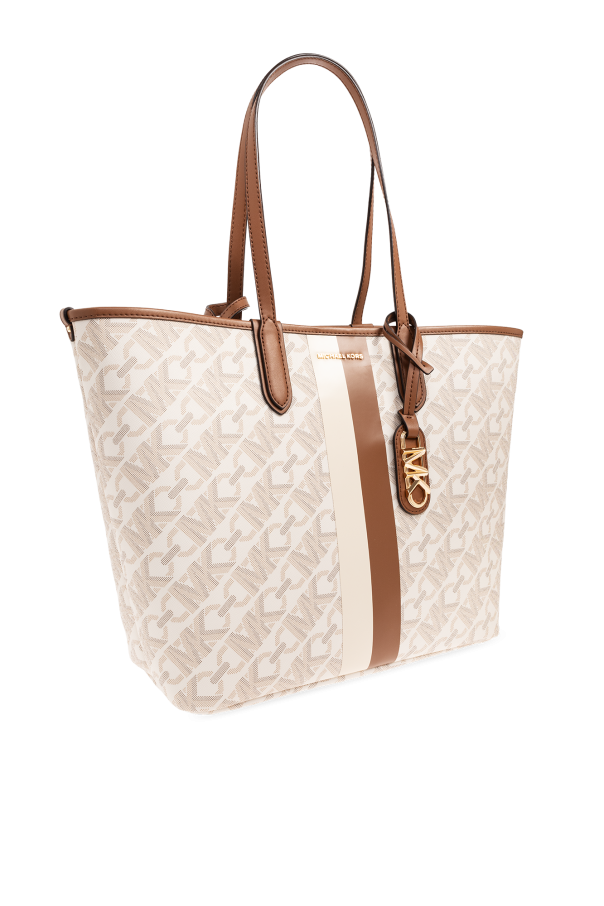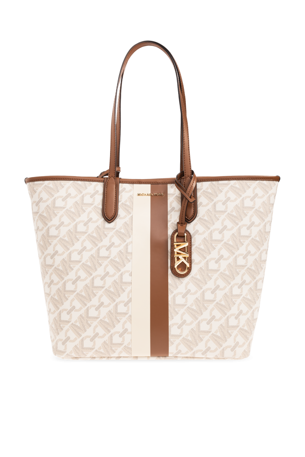 Cream and brown ‘Eliza Large’ shopper bag from Michael Michael Kors. Made of coated monogram canvas, this model features a snap closure, metal logo detail, printed stripe, detachable charm, two half-round handles, gold-tone metal hardware and one internal compartment with a removable snap-fastened pouch with a strap.