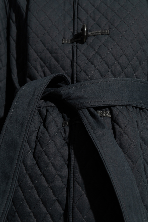 Introducing the \'Ella\' Coat - a paragon of sophistication and functional elegance, presented by the esteemed A.P.C. This mid-calf length coat, rendered in a sumptuous navy hue, is a testament to understated luxury. Crafted with a quilted texture, its fabric composition boasts an exterior and lining of 100% cotton, with a filling of 100% polyester, ensuring both warmth and breathability. The \'Ella\' diverges from traditional outerwear with its short sleeves, making it a standout piece with a unique sartorial edge. Its hood adds a practical element, blending seamlessly with the coat\'s refined aesthetics. Adorned with contrasting black decorative fastenings along the front, it strikes a harmonious balance between elegance and function. The inclusion of a belt, fashioned from the same quilted fabric, allows for waist definition, enhancing the silhouette. The coat\'s rear continues the quilted pattern in a sleek, unembellished design, maintaining the garment\'s minimalist integrity. Attention to detail is evident in the craftsmanship of the closures and belt, hallmarks of high-quality attire. Why Purchase the \'Ella\' Coat? Unique Design: Short sleeves and quilted texture offer a distinctive look. Luxurious Composition: 100% cotton exterior and lining with a polyester fill for comfort and warmth. Attention to Detail: Elegant black button closures and a self-fabric belt highlight the coat\'s superior craftsmanship. Versatile Functionality: A practical hood and mid-calf length for various weather conditions.