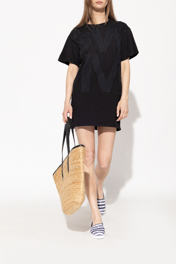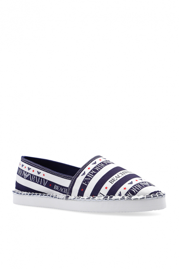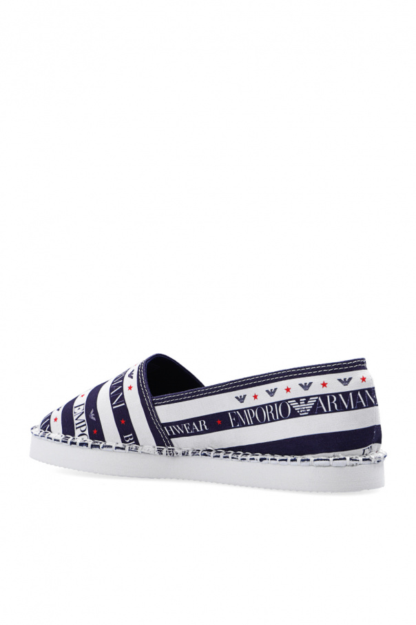 Navy and white espadrilles from Emporio Armani. Crafted from cotton, this pair features a stripe pattern, logo detail and white rubber sole.