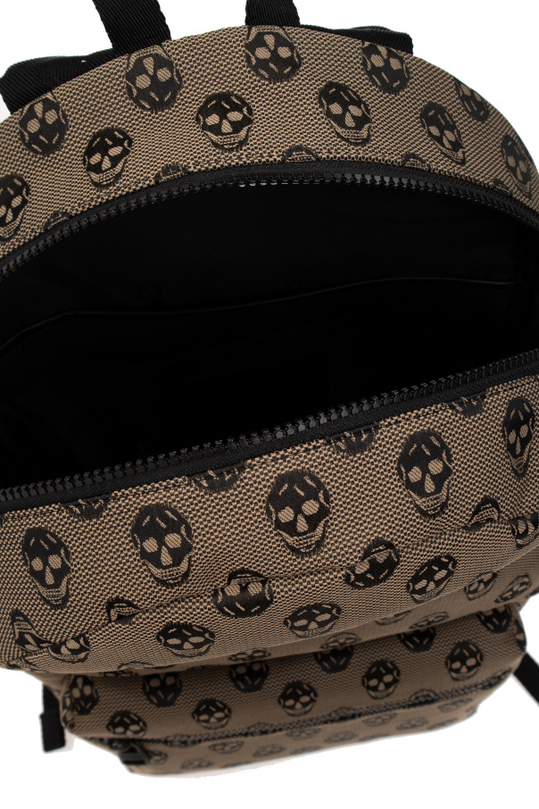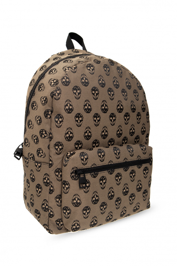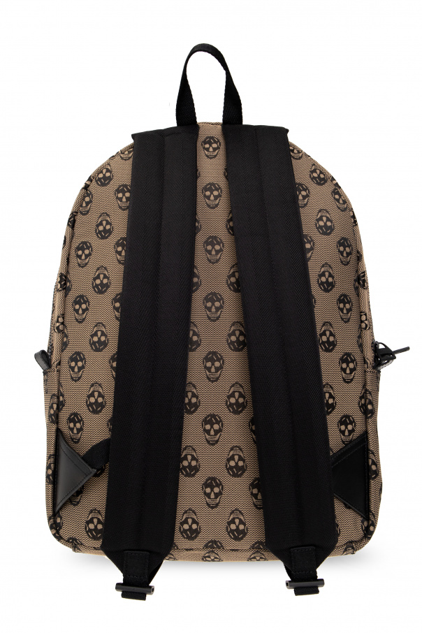Brown and black backpack from Alexander McQueen. Crafted from canvas embroidered with the label’s signature skull motif, this model features a two-way zip, front zip pocket, half-round handle, adjustable shoulder straps and one internal compartment with two slip pockets and one card slot.