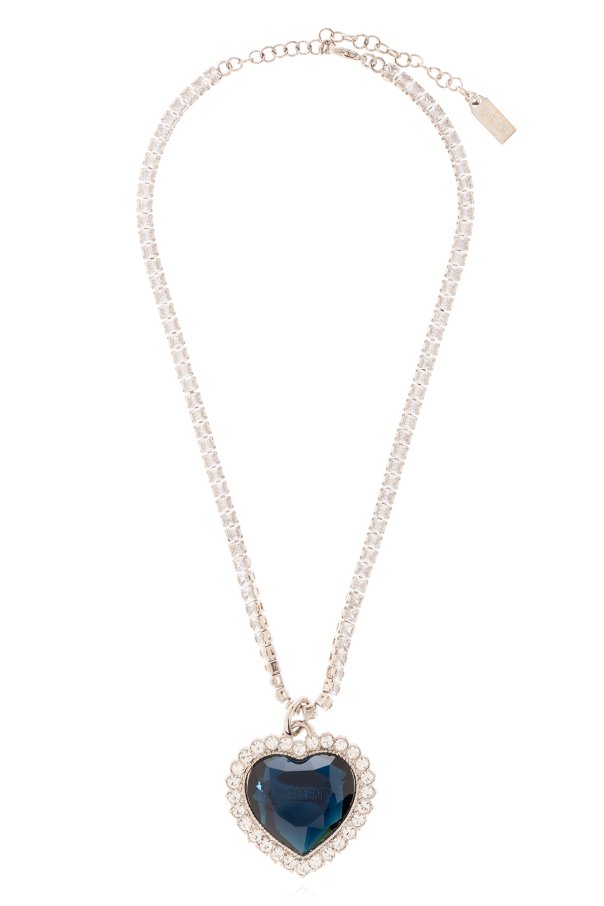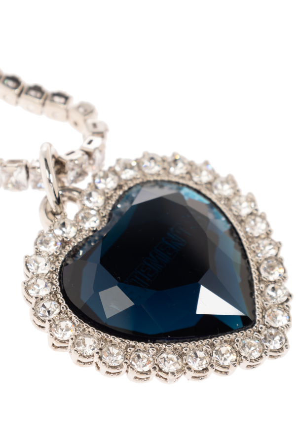Silver-tone necklace from VETEMENTS. Made of brass, this item is enriched by sparkling crystals and features an adjustable lobster clasp closure and a heart-shaped pendant encrusted with a blue crystal.