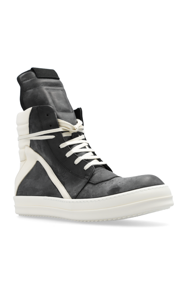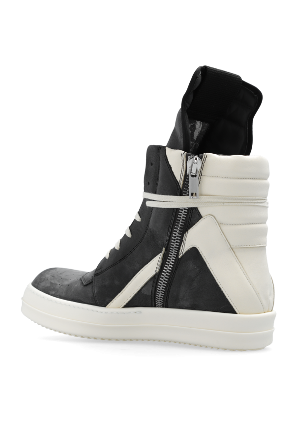 Black and white high-top sneakers from Rick Owens. Made of leather, this lace-up pair features a side zip, decorative tongue, worn effect, perforated almond toe and white rubber sole.