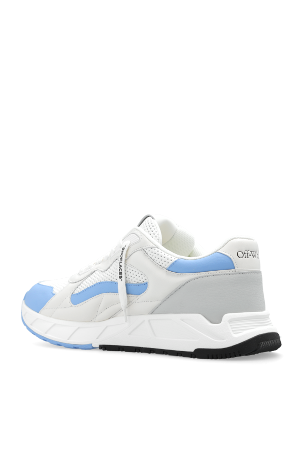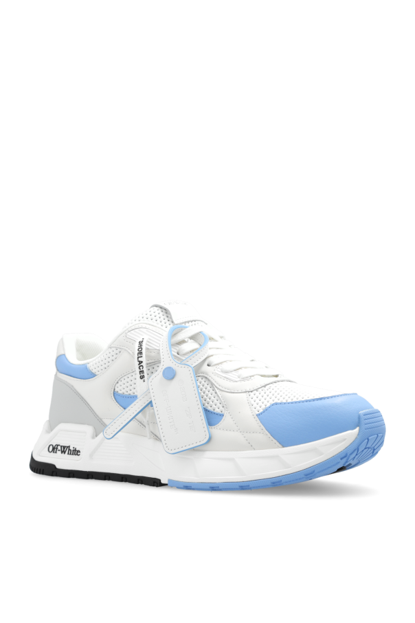 White, blue and grey ‘Kick Off’ sneakers from Off-White. Crafted from smooth and perforated leather, this lace-up pair sits on a black, blue and white rubber sole and showcases a logo and the brand\'s signature zip tie.