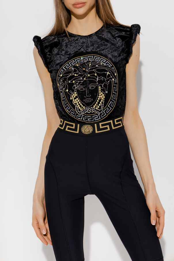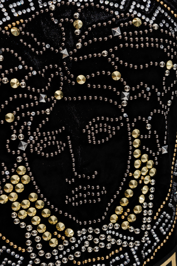 Black velour body from Versace. Fastened with a zip and hook, this design features padded shoulders and a studded Medusa with spikes and crystal embellishments at the front.