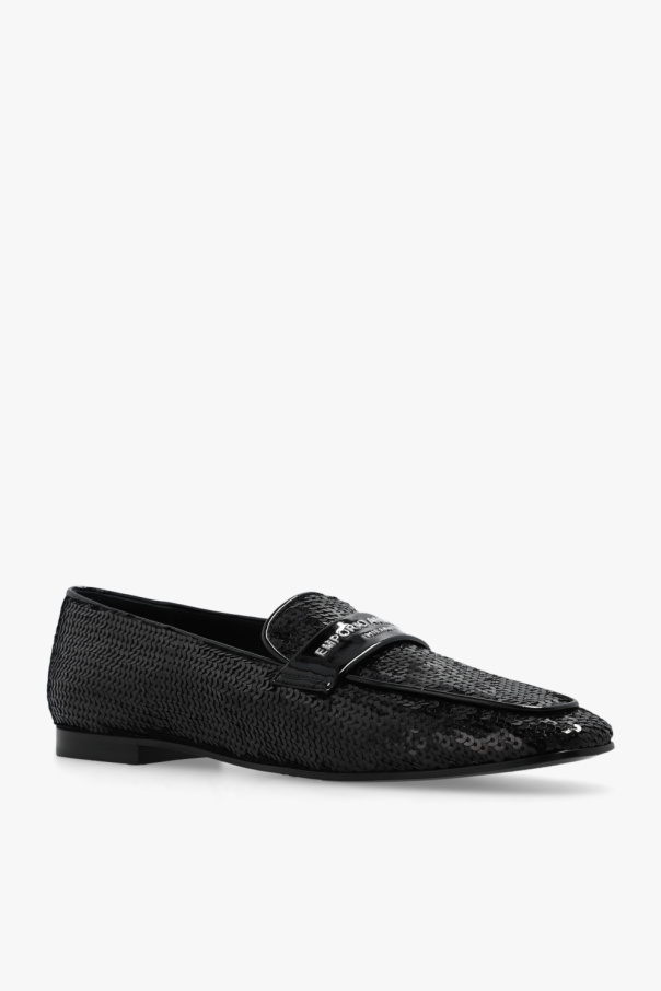 Black loafers from Emporio Armani. Spruced up with sequins, this model sits on a black sole in leather and rubber and features silver-tone logo hardware on the front.