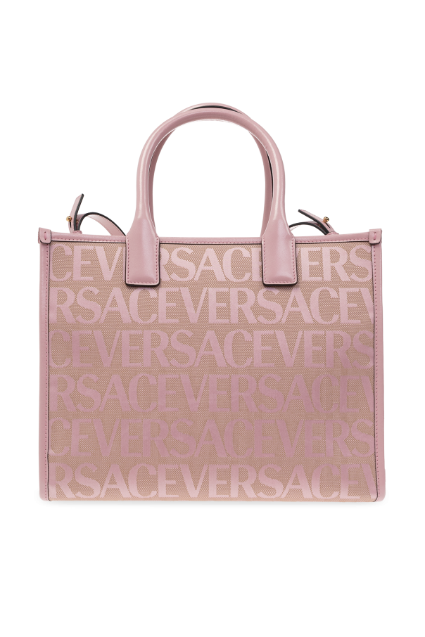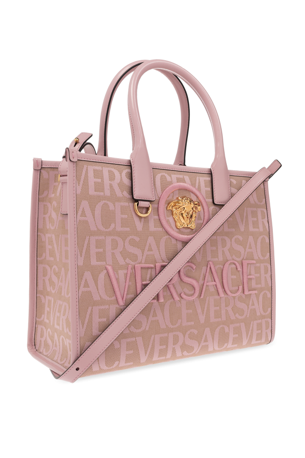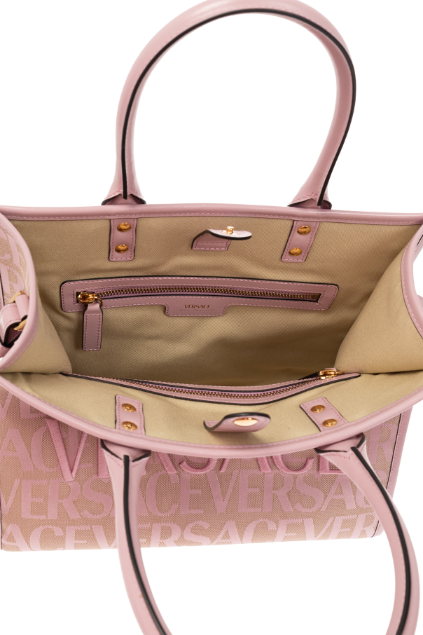 Pink and beige shopper bag from Versace. Crafted from monogrammed canvas and trimmed with calf leather, this design secures with a snap and showcases an embroidered logo and signature the brand\'s Medusa face plaque on the front. It is complete with a detachable and adjustable shoulder strap, two half-round handles, gold-tone metal elements and one internal compartment with two zip pockets.