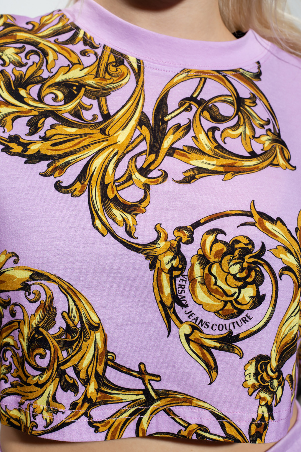 Purple crewneck T-shirt from Versace Jeans Couture. Made of cotton with a cropped and oversize silhouette, this style features a yellow, orange and black Barocco print with an accompanying logo.